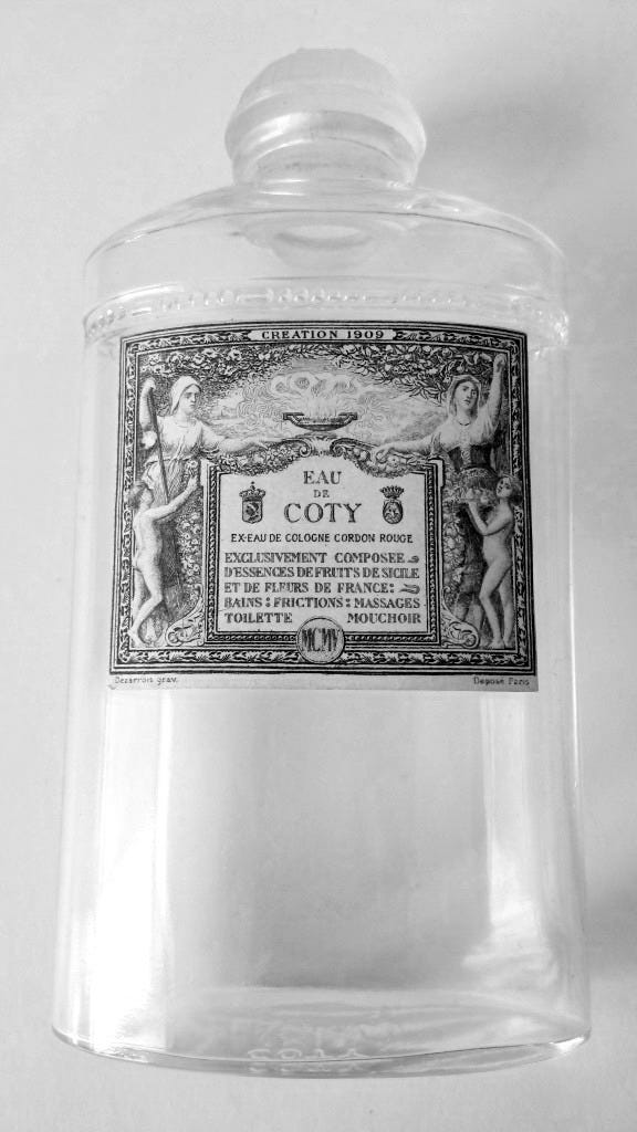 Years later, when he was a master perfumer with works like Rose Jacqueminot, L'Origan and Chypre to his name, Coty began thinking about Cologne once more. Being a pioneer he made something different, and to see how different it was, I am going to compare his Cologne with three others that were on sale at the time : 4711, Roger & Gallet Extra Vielle and Eau de Cologne du Coq.